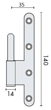 1/2 Paumelle EXS 1.62-M, 140*70 bouts ronds. Mâle gauche inox brossé, nœud diamètre 14 mm, coins arrondis sans bague d'usure de 3 mm