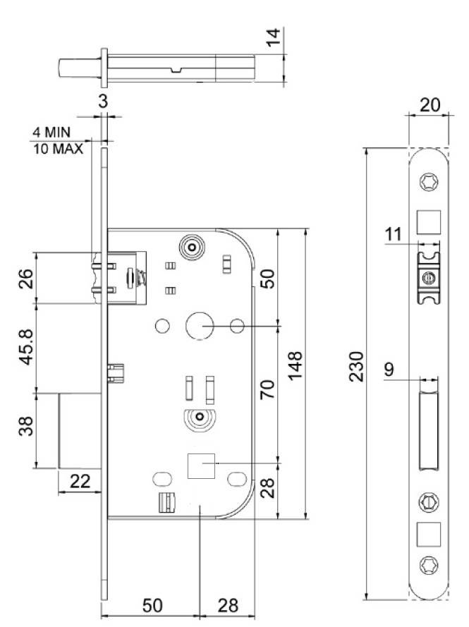 Serrure EXS 17, condamnation à rouleau axe 50 mm bouts ronds inox sans gache